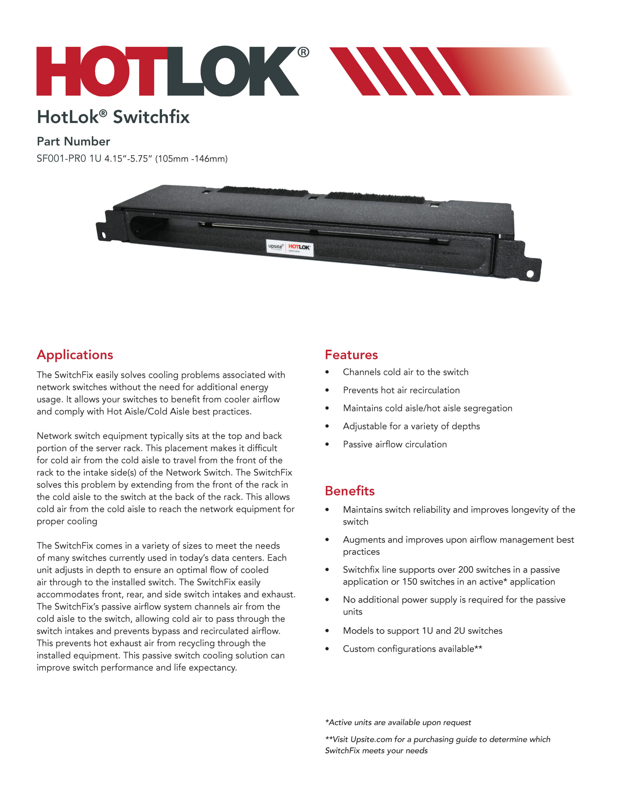 The SwitchFix comes in a variety of sizes to meet the needs of many switches currently used in today’s data centers. Each unit adjusts in depth to ensure an optimal flow of cooled air through to the installed switch. The SwitchFix easily accommodates front, rear, and side switch intakes and exhaust. The SwitchFix’s passive airflow system channels air from the cold aisle to the switch, allowing cold air to pass through the switch intakes and prevents bypass and recirculated airflow. This prevents hot exhaust air from recycling through the installed equipment. This passive switch cooling solution can improve switch performance and life expectancy.