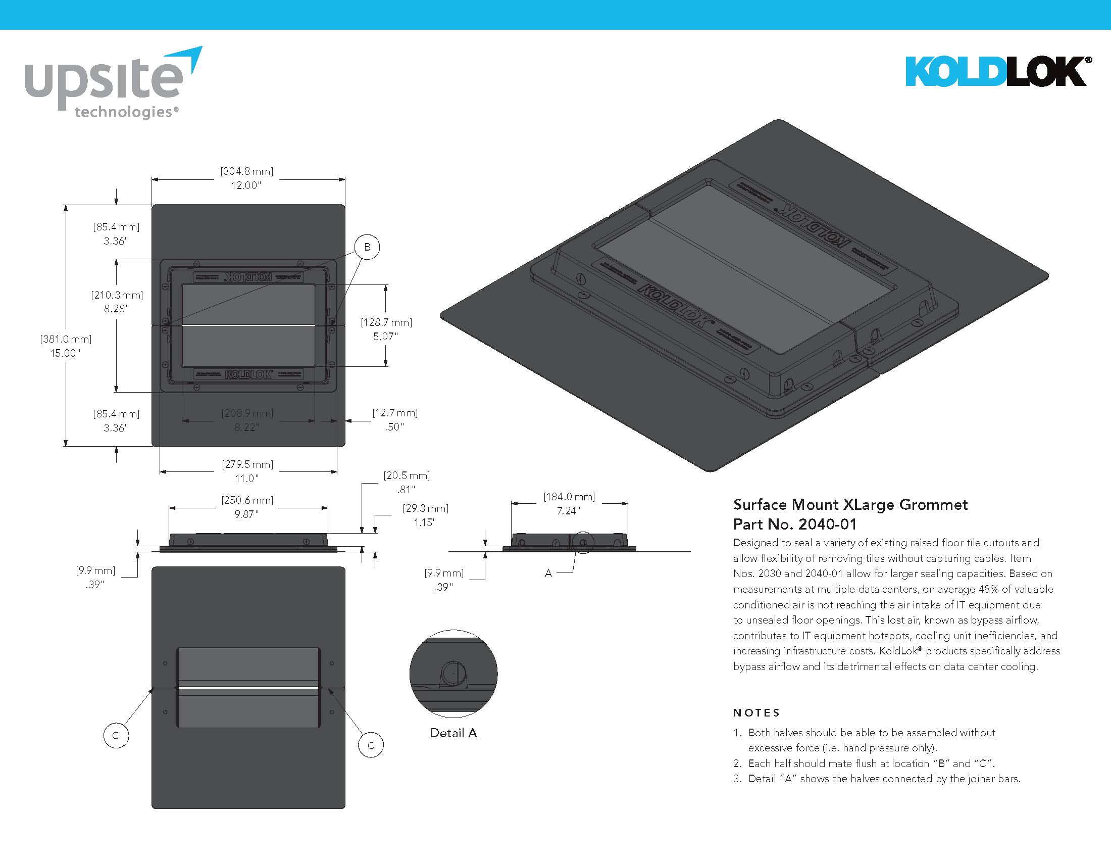 Designed to seal a variety of existing raised floor tile cutouts and allow flexibility of removing tiles without capturing cables. Item Nos. 2030 and 2040 allow for larger sealing capacities. Based on measurements at multiple data centers, on average 48% of valuable conditioned air is not reaching the air intake of IT equipment due to unsealed floor openings. This lost air, known as bypass airflow, contributes to IT equipment hotspots, cooling unit inefficiencies, and increasing infrastructure costs. KoldLok® products specifically address bypass airflow and its detrimental effects on data center cooling.